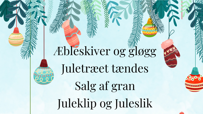 Vi sælger gran og dekorationer, der serveres gløgg og æbleskiver og vi klipper og klistre julepynt til det juletræ der skal stå i Sognehuset hele december. Når juletræet på Bygaden tændes, vil vi sammen synge nogle af julens dejlige sange.
